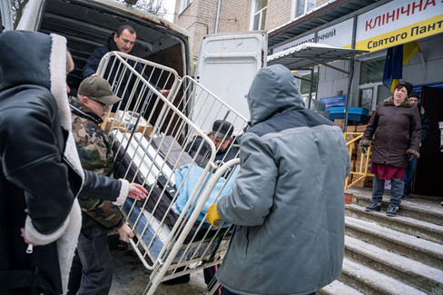 Unsere letzte Fahrt auf diesem Einsatz führt uns nach über vier Stunden durch eine Schnee- und Eislandschaft, vorbei an zahlreichen Checkpoints, zu einer Klinik nach Sumy. Die Stadt, die während der russischen Invasion längere Zeit belagert wurde, liegt tief im Nordosten der Ukraine und nur ca. 35km von der russischen Grenze entfernt. Die Stadt befindet sich somit in unmittelbarer Reichweite der russischen Artillerie. Bei Raketenalarm bleiben maximal 1-3 Minuten um Schutz zu suchen. Zu kurz um Patienten noch rechtzeitig in Sicherheit zu bringen.